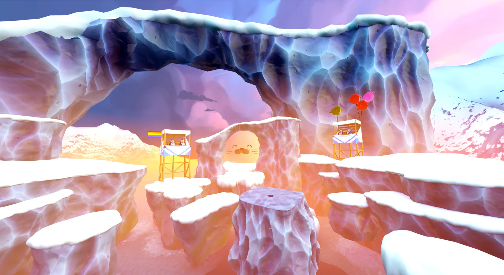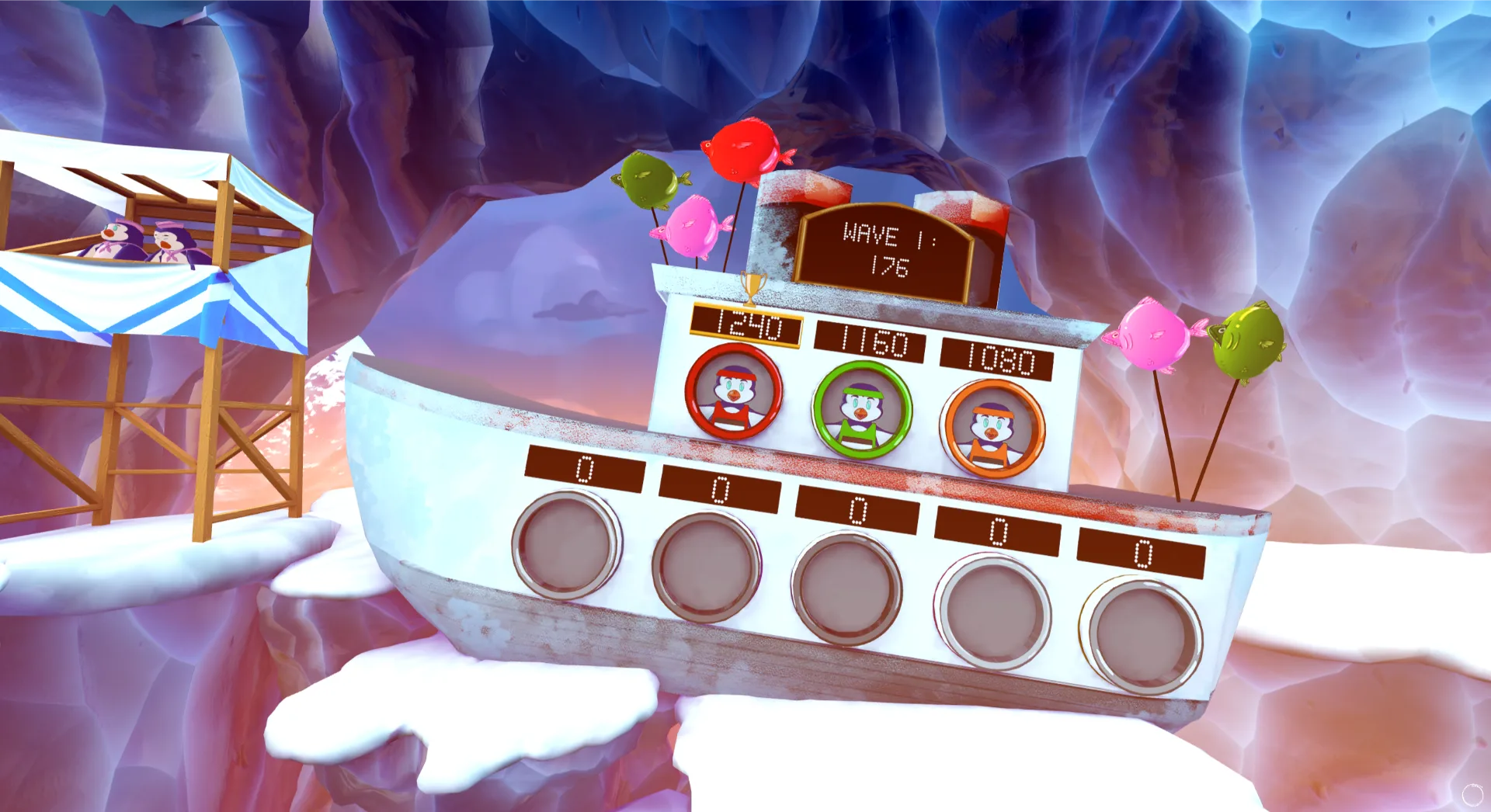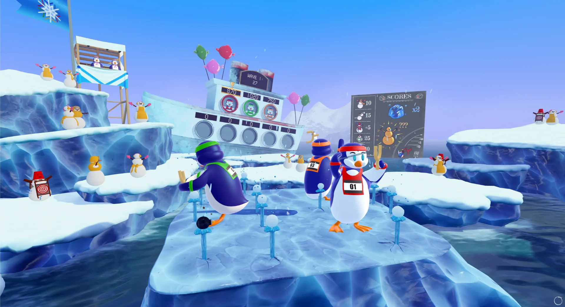 On a drifting ice floe, you and your crew sling snowballs at targets popping up all around. Grab power-ups, keep moving, and outscore your friends before the timer hits zero.